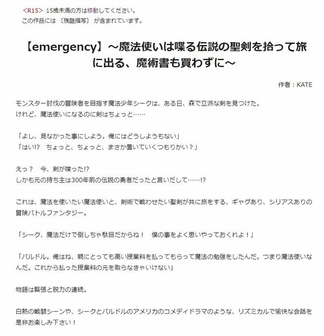 「【emergency】~魔法使いは、喋る伝説の聖剣を拾って旅に出る……魔術書も買わずに~」を読んでみませんか?