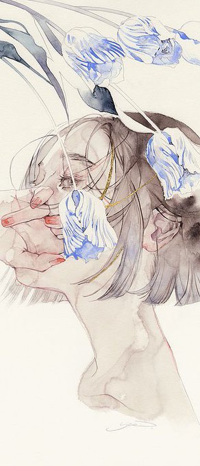 視線や口元に、楚々(そそ)とした色気漂う #YUE さんの作品。淡くにじむ色彩と、あしらわれた金箔に、和の趣を見る。涼やかな表情のわけは、”花のみぞ知る”だろうか。じっくりと鑑賞して、貴方が思う物語を想像してみませんか。