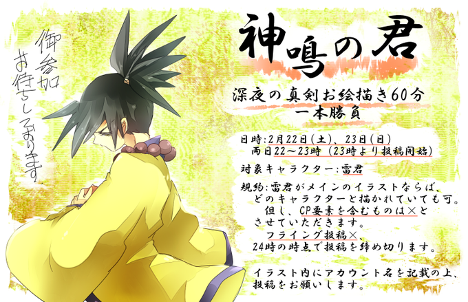 雷君ワンドロを開催します!日程は2/22(土)、23(日)の22:00~23:00、対象キャラクターは雷君。雷君メインのイラストならば誰でもご参加可能です。#音ゲーワンドロ予告 #神鳴の君深夜の真剣お絵描き60分一本勝負