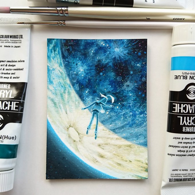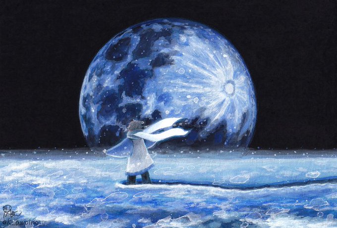 夜っぽい…というか夜そのものを描いた、アクリルガッシュ+色鉛筆のアナログイラストです🌝💫💪☁️💪🌨🌘