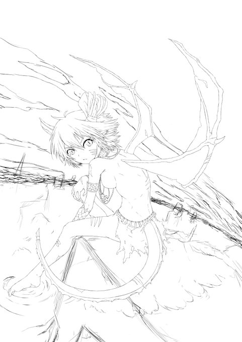 下絵終わり。 ファンタジーっぽい服とのことで、ファンタジーっぽいアクセと現代の小物を追加。 全身に傷跡を追加。 やってるうちに世界観が固まったので、背景に沈んだ建物を追加。 空は赤がいいとのことで、背景色は黄→橙→赤のグラデ―ションを採用予定。 背景は線画描いても塗りつぶすので省略。