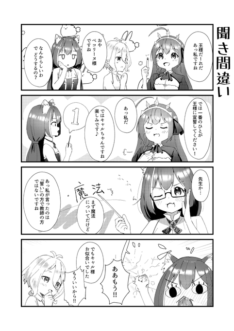王様ゲームで聞き間違いをする美食殿の4コマ
