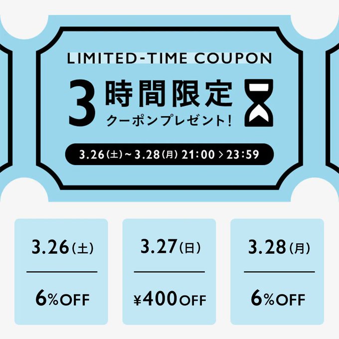3/26(土)から3/28(月)までの3日間、毎日21時から #minne にてお買い物クーポンが配布されます♪