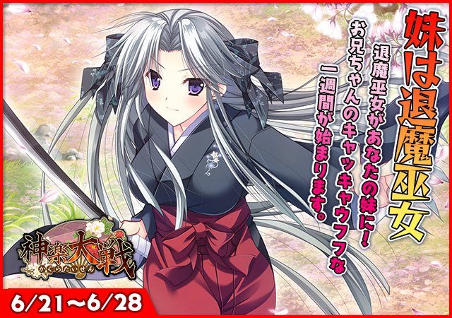 明日6月21日(金)の午後2時より、更新メンテナンスを行います。次回イベントは弥生ピックアップとして一週間限定となります。 #神楽大戦・陽之巻 https://t.co/YUUpKabOWS