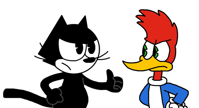 Felix the Cat and Woody Woodpecker in style of Paul Rudish Mickey Mouse series. #FelixtheCat #WoodyWoodpecker