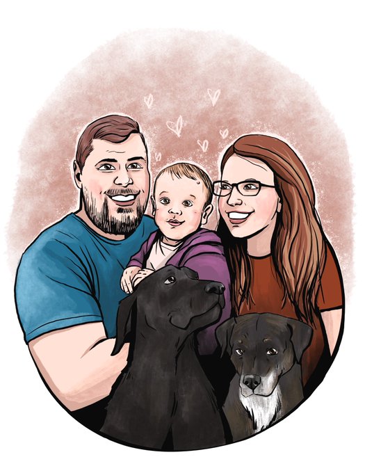 Family portraits, sometimes character design for folks, sometimes wall murals or wood panel paintings. A lot of pet portraits because I love them! It varies.