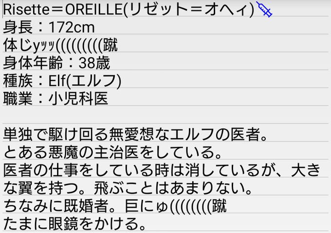#うちよそって呟くとうちよそしたい人からふぁぼが飛んでくる エルフ族の医者、Risette=OREILLE(💉)です。 オリ骨でいらっしゃってもいいですよ。 ふぁぼでどうぞ。 ただし私は性格が悪いのでやりたいと思った方だけ呼び出します。 ⚠️注意⚠️ ・相互様限定 ・えちちNG