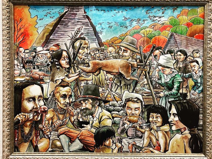 Richly illustrated Thanksgiving painting (ink, watercolor on paper) by resident artist David Mejia currently on view and available at KALEID.