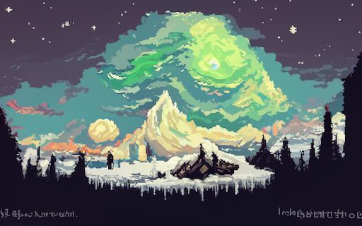 Just making a quick comparison chart for some #pixelartdiffusion settings and then I'm launching it! Here's an example image for the prompt [“An icy tundra under the aurora, #pixelart painting by vincent van gogh and Frederic Edwin Church”,”#pixelart”]
