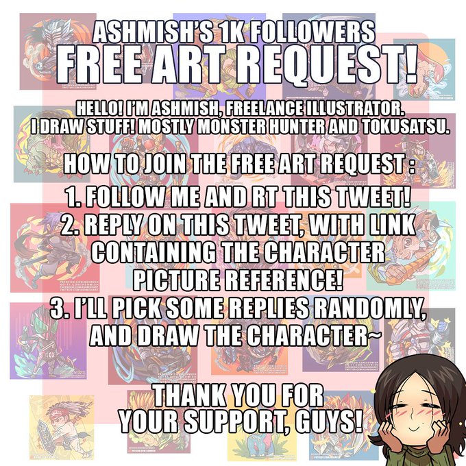 Woop, just noticed there are more than 1000 people following me on twitter! Time for some free art request! Check out the image for the details if you want to join! 😄😄
