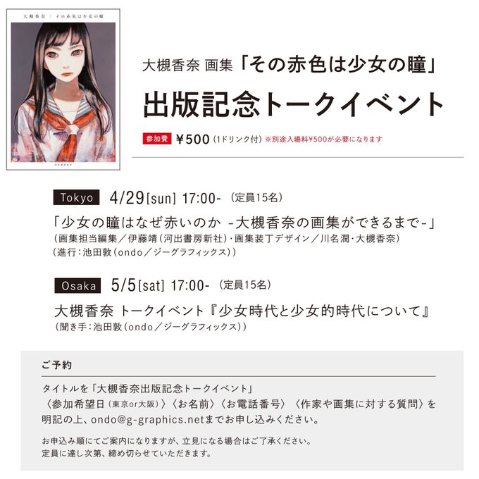🔴4月26日〜5月6日まで大阪・東京のギャラリーondoにて、大槻香奈画集「その赤色は少女の瞳」出版記念展が開催されます!トークイベントも御座いまして、こちら予約制ですのでぜひぜひメールお待ちしております☺️(東京会場は神楽坂の方ではありませんのでご注意ください!) #その赤色は少女の瞳