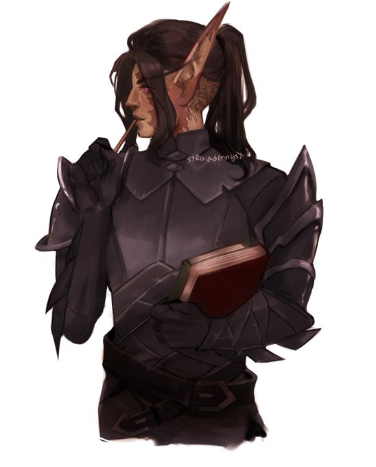 @Sunreign Ine'theas is a Sunreaver and was imprisoned after the purge of Dalaran. He specialized in defense and utility magic but he turned into a workaholic and worked on his offensive spells! C: He has a Sunreaver tattoo on his chest and runes on His hand and scalp (on his undercut)