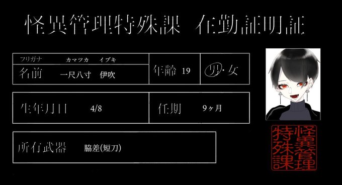 #かいあけ_管理課CS [怪異管理特殊課]一尺八寸 伊吹(カマツカ イブキ) 夏太郎(@DvzRObaKL8dyEs0 )宅