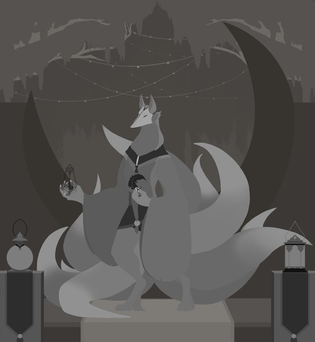 For my lantern carriers, I was messing with the leader. She starts as a normal fox and goes through a very long life and transformation over time. The idea is she's the only lantern carrier that started out as a feral animal and not an anthro one. #kitsune