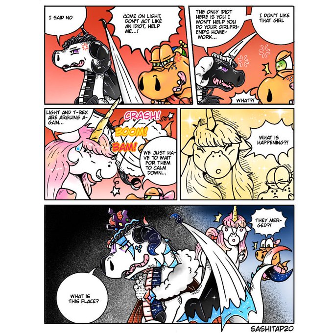 new short of my a lucky dinosaur I hope you like it is titled the merger is now available in tapastic 🦖💖#tapastic #comic #dinosaur