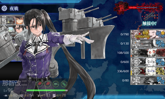 重巡さんとやりあうときは毎回おてがら…もとい足柄さんが決めてくれる印象😊。ドロップは川内ねーさん。