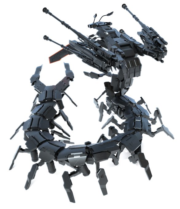 【フォロワー2000人記念ロボ】 遂に完成しました、でっかいムカデロボです。 お題: ムカデ キャタピラ ワイヤードクロー 両肩キャノン 武器腕マシンガン 腕部武器