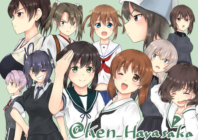 フォロワー1000人突破記念イラスト描けました! 艦これ、ガルパンから5人ずつ、はいふりからミケちゃん! そして大洗カミーユもいるぞ!!! これからもよろしくお願いします!(*'ω'*)9