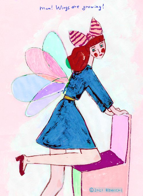 おはよー。本日の絵「ママー、羽が生えてきたァ」