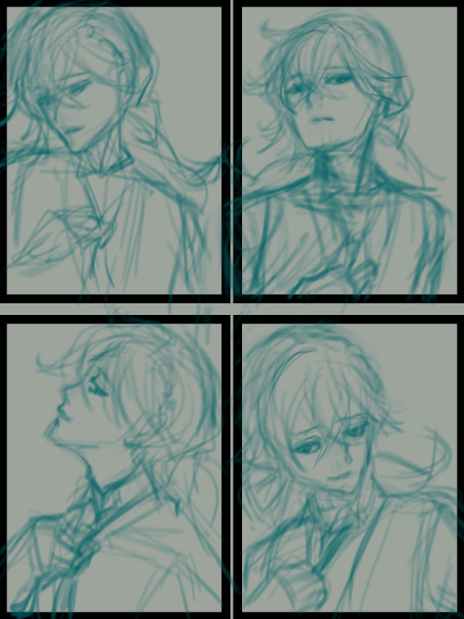 ラフ案的なもの。 ネクタイ緩める絵のタグが楽しそうだったのでそれを描いてみたいなーと思っていくつか描いてみました。 左上のは微妙に前回のバスローブ絵と似てる気がするから没かなぁ。 どれにしようかまだ悩み中……。