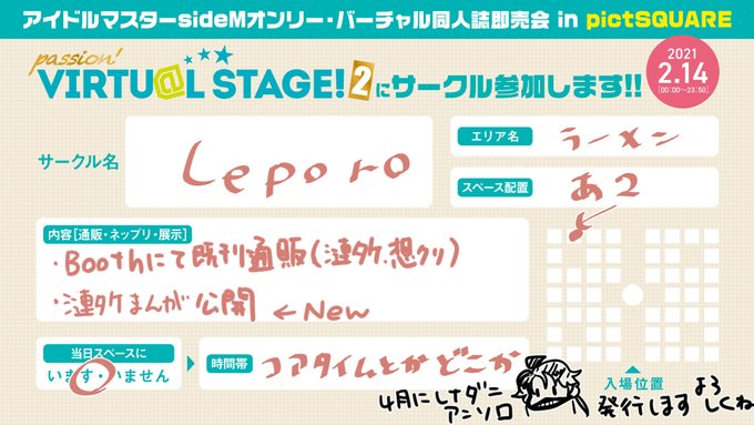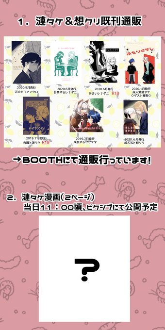 @side_full 明日のパバステ2参加します!ラーメン・あ2です。新しいものは漣タケらくがき漫画を公開予定です!(今描いてます)他は漣タケ・想クリの既刊をBOOTHにて通販行ってます~よかったら遊びに来てください!よろしくお願いします!!