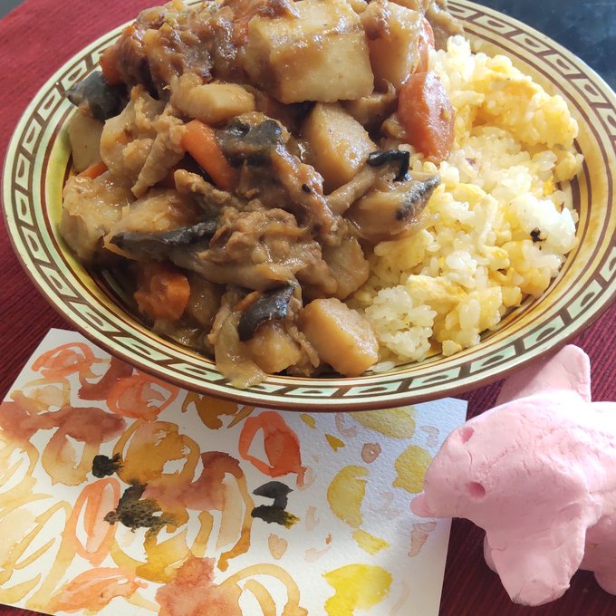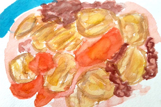 【食べ物スケッチ:2021.9.19】 ○肉じゃがライス 洋風に盛り付けてみました。 #イラスト #スケッチ #日々描く #食べ物スケッチ #透明水彩 #長芋 #肉じゃが