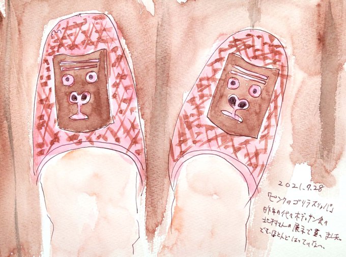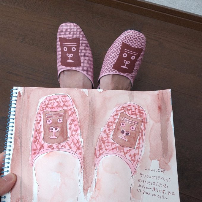 2021.7.28:スケッチ絵日記『ピンクのゴリラスリッパ』 昨年行った展示で一目惚れして買ったスリッパを描きました。 でも自宅では裸足なので、ほとんど使ってないです。 来客用として使われる時を静かに待っています。 #uskj #日々描く #イラスト #スケッチ #絵日記 #ピンク #ゴリラ #スリッパ