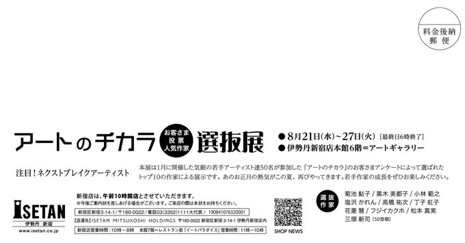 遅ればせながら、本日より* ・アートのチカラ選抜展・ 2019.8/21〜8/27 新宿伊勢丹本館6F アートギャラリー 作品5点を出品致します。