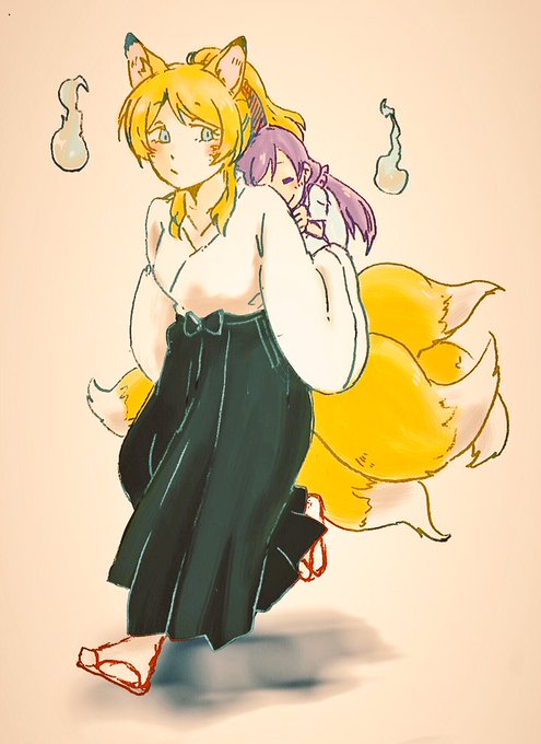 遊び疲れたのんちゃんをおぶってかえる妖狐チカ