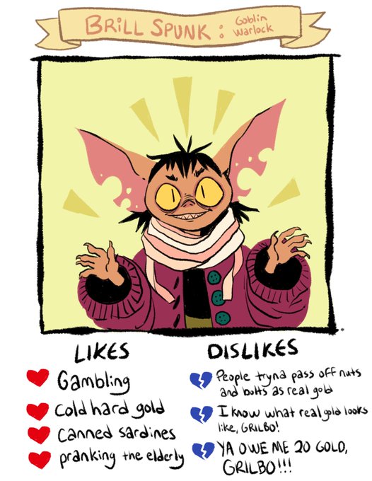 Day 9: Meet Brill Spunk! They’re a goblin warlock lookin for fun, adventure, and for their next get rich quick scheme. Also 20 gold, if ya happen to have it. #dnd #inktober #inktober2018