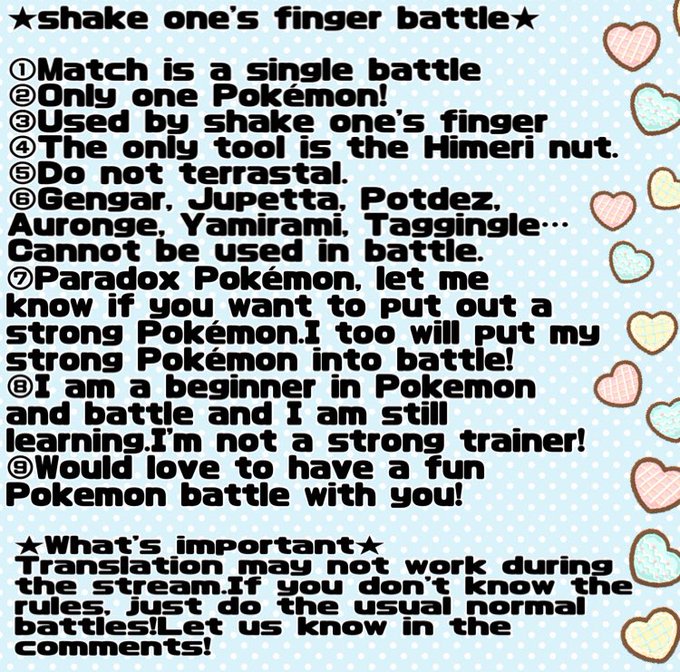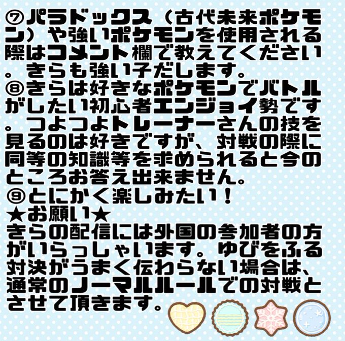 おはきらぁ🌟本日はポケモンSVゆびをふる参加型やっちゃいますよう✨いつか大会も開催できるように試行錯誤しながら対決出来たらいいなぁ🙏💕画像のルールみてみてねっ(っ ‘ ᵕ ‘ c)✨✨