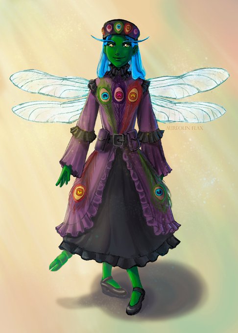 MoKaM's protag is Calinthe Erytrichos, an intersex aroace dragonfly-person. She is a merchant of knowledge who travels across the planes of the Pentagonal Dominion in search of secrets to fuel her boss's magic.