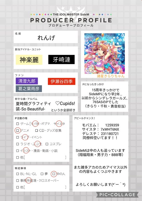 1年経ったのでPプロフィールを更新しました~無言フォローOKのシンデレラ、765AS、SideMPです!時々イラスト描きます(^-^)よろしくお願いします #MマスPプロフィール #SideM好きさんと繋がりたい #デレステPさんと繋がりたい
