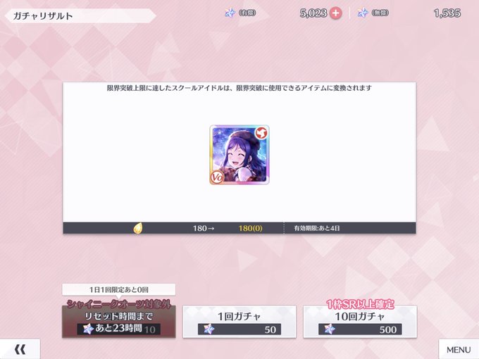 フェス残り70連やってぽむちゃん天井交換するかぁって思ったら、10連でフェスぽむちゃん来てくれたぁぁあ!!!🙌🙌🙌 フェスことりちゃんもナイスぅ!👍 未ホラSRダイヤちゃんに向けてスター温存できる😊 クオーツはSRほのリナに交換で😇