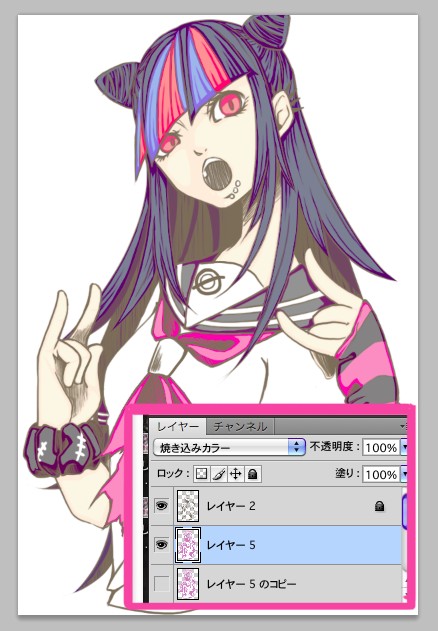 影レイヤーを複製して、上のレイヤーを不透明度100%で焼き込みカラーに、下のレイヤーを不透明度50%でぼかしをかけて焼き込みリニアに。