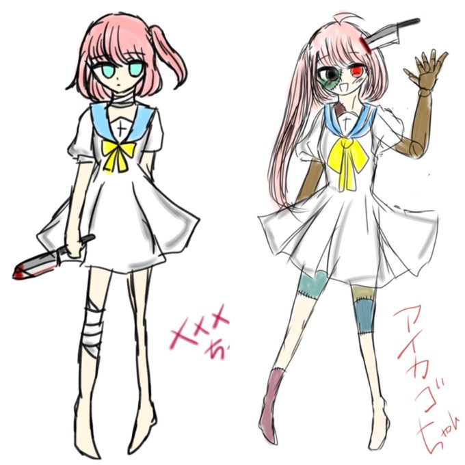 アイカゴちゃん とある女の子を蘇らせた姿、いわゆるゾンビという存在。 足りないパーツはアイカゴちゃん本人が拾ってきたもので補った。 素直で真面目、基本的に人畜無害だが頭の包丁を取られると態度が一変する。 #ぺぺろん創作
