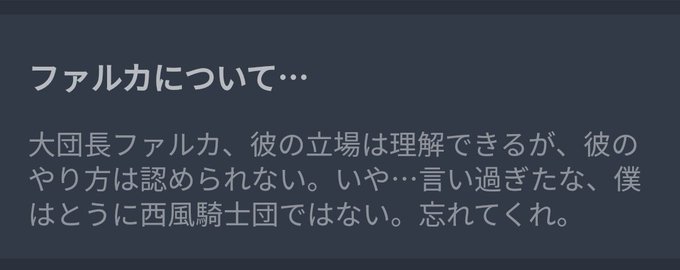 @NOWAWAdayo YES 指輪「騎士団の面子が潰れるから君の父ちゃんの活躍はなかった事にするやで」 旦那「は?騎士団やめます」 ↓ 旦那「ファルカのやり方は気に入らない」 みたいな感じだから多分団長だと思われ