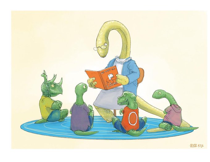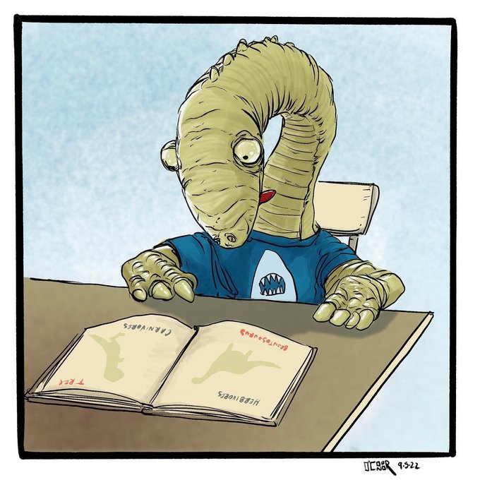 Nueva ronda mensual de ilustraciones dinosaurianas más variadita que nunca: desde #dilophosaurus como mascotas hasta una vuelta al cole movidita, pasando por un #terópodo #prepper