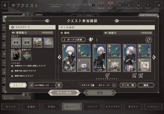 リィンカネ やっと真暗キャラを開放。 ここまでにデイリーの真暗クエで落ちた天頂はわずか2個、色んな方法で手に入れやすくなったこと鑑みるとデイリーはスキップ機能実装まで2-3人分消化でいいと感じます。 キャラを手に入れる試練は普通に手持ちのフレン使えますし、火力ゴリ押しPTでOKです。