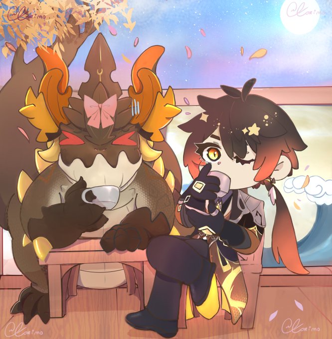 No me apetecía dibujar nada serio asi que hice este dibujo de Zhongli tomando una taza de té con un incómodo azhdaha. Me hizo mucha gracia ponerle un lacito rosa xD En el fondo me inspire en las decoraciones de mi casita en el Genshin. Tardé unas 5h. #Zhongli #HeartofBedrock.