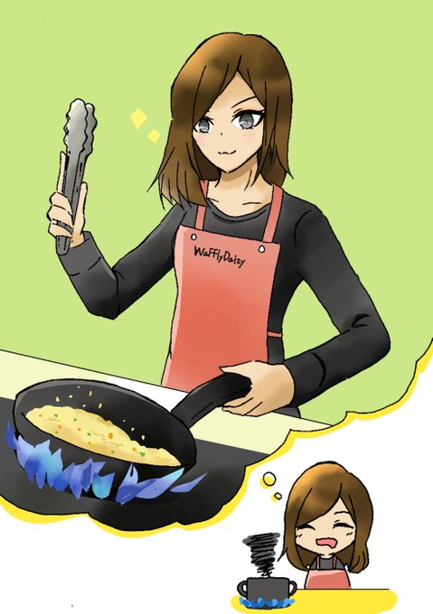 イラストスタッフ りかさん作のWaFFlyDaizy 藍樹魅那のイラストです💓 フライパンでお料理を作っているところですね🍳✨ 視線がフライパンに注がれていて集中している様子です🎵 美味しいお料理ができたかな❓️😋