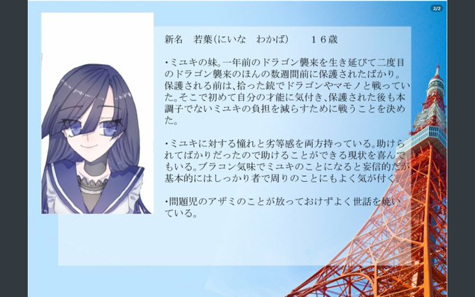 新しい自キャラの設定とキャラ紹介 一枚めの人の説明が世界観設定を兼ねている