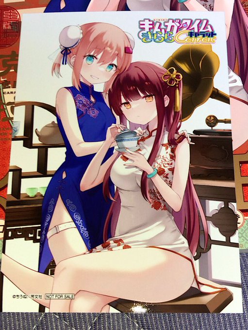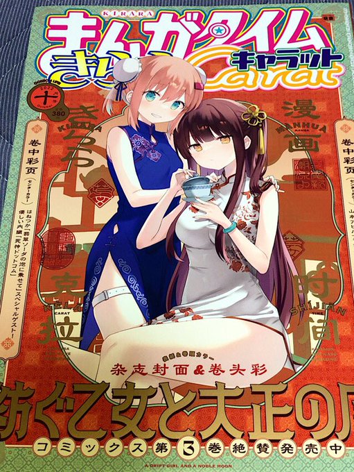まんがタイムきららキャラット10月号。紡ぐ乙女と大正の月です。表紙&巻頭カラーです。今回の表紙も素晴らしいですね。チャイナ服の紡と旭。旭のボリュームある胸と太もも!!紡の笑顔と美脚、更に散りばめた中国語