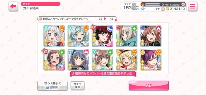 頑張ってFC埋めとかでスター稼いで 回した結果…………!!!!! スターが丁度(?)2,525個で 「僕もこの10連でにこにこになるぞぉ!」って。 この前の友希那さんと言い運使いすぎでしょ…