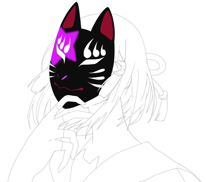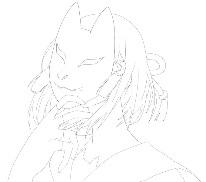 狐ヶ咲甘色ちゃん描いてるけど中々によく描けてる気がする(線画だけ) お面は頑張って塗ったけど残りを無事に塗れるだろうか……