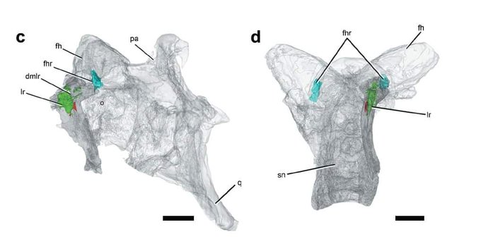Un nuevo estudio de miembros del LACEV redescribe el cráneo de Carnotaurus y agrega información anatómica de los carnívoros abelisáuridos, incluyendo el casi-desconocido paladar, y se descubrió que los grandes cuernos estaban en parte ocupados por sacos áereos.