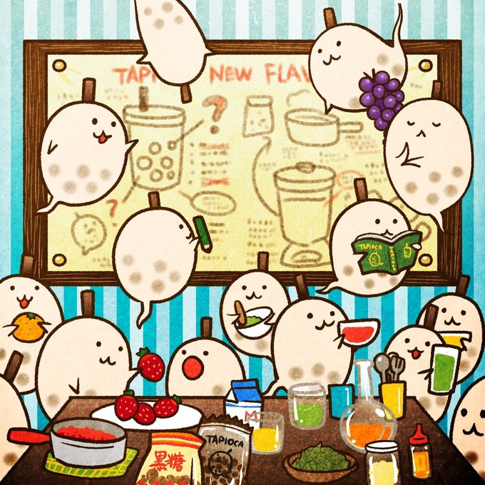 タピオカオバケさん皆で新フレーバー研究中🐕天然素材のカラータピオカ、何が美味しいかな? #タピオカ