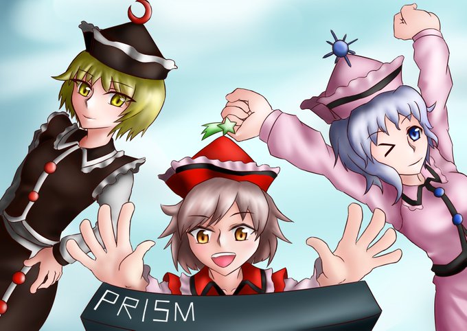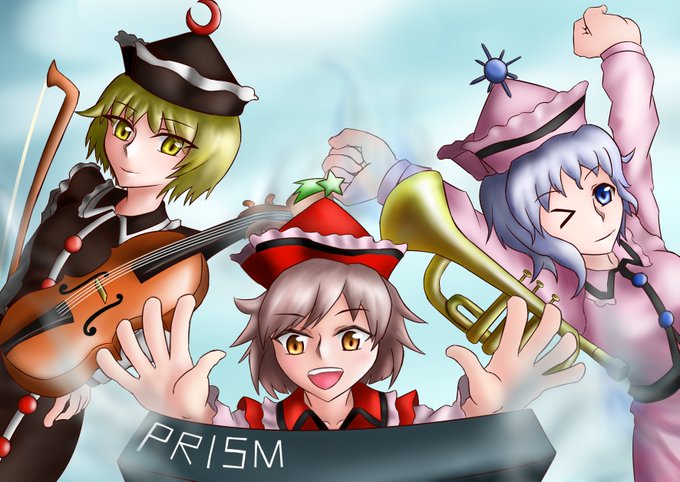 こないだから描いてたプリズムリバー三姉妹ようやく完成。楽器とか描けないから騒霊オーラ?で積極的に隠す。流石に濃すぎた気もする 毎回描くときは原作絵を検索してガン見しながら描くんですが、服の着崩しとか靴下巻いてたりちゃんと伸ばしてたりそれぞれ結構違いがあって楽しいですね。