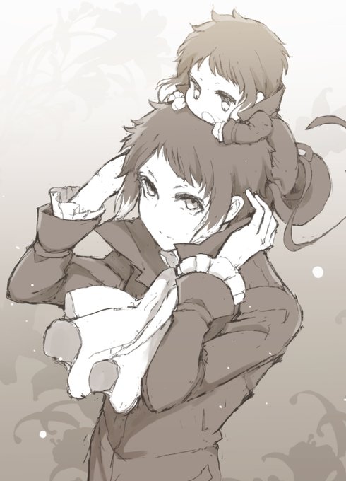 文豪ストレイドッグスの芥川龍之介と小さい芥川龍之介。小さい龍之介は遊び疲れて膝の上で眠ってしまいました。 #イラスト #絵