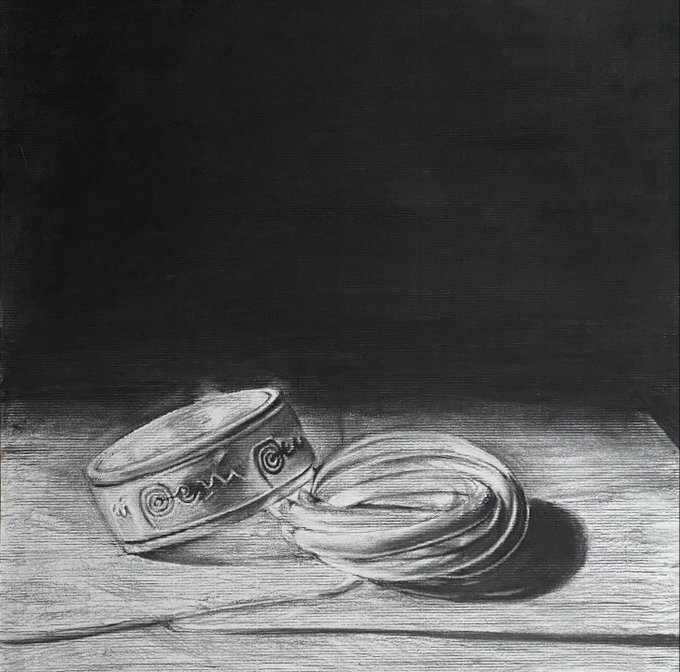 @theartofed Reductive charcoal “meaningful object” drawings with intense lighting (example from last yr), continuous contour line group portraits, pastel silverware still life (example from last year), and as always, their sustained investigation pieces and visual journals...